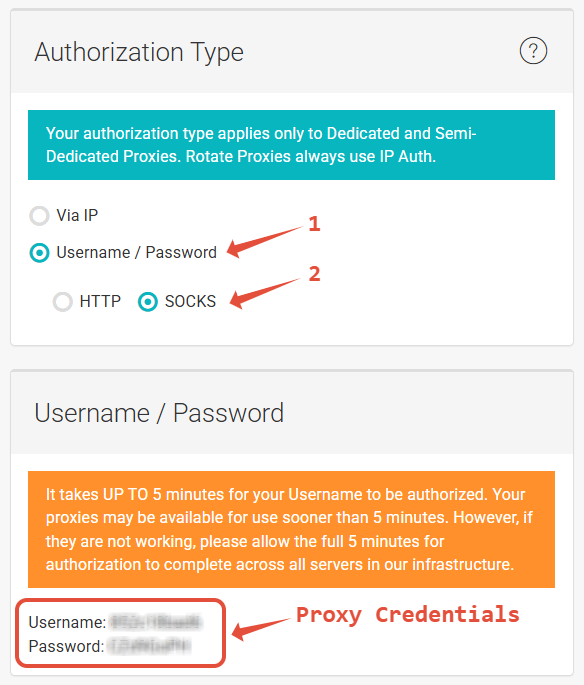 - Select Authorization Type → Username/Password → SOCKS.